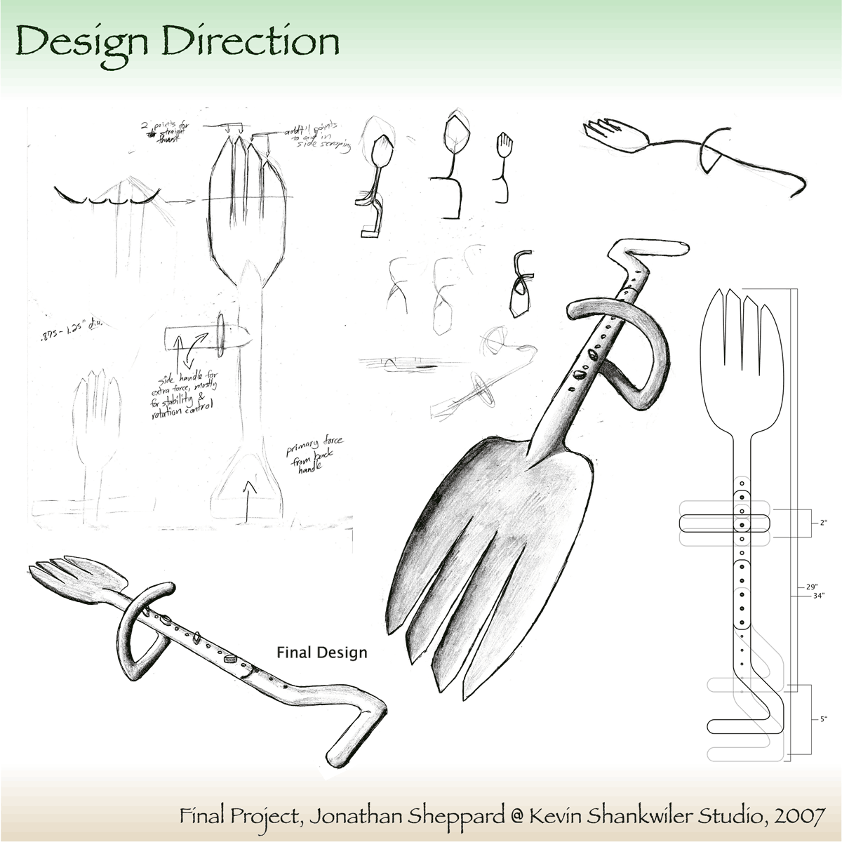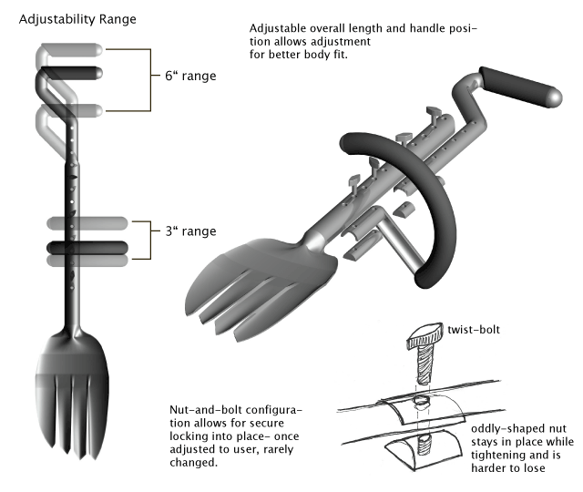 Although the biomorphism of my final design was not quite so blatant, the digging claws were still the primary inspiration. I incorporated the idea of claws into the design of a somewhat standard shovel to create a novel digging blade combined with two ergonomic handles that could be adjusted for body size. As the culmination of two semesters of study, the final design was made with function, body fit, form, materials, and sustainability in mind, as demonstrated in the design overview (PDF format; opens in new window.)