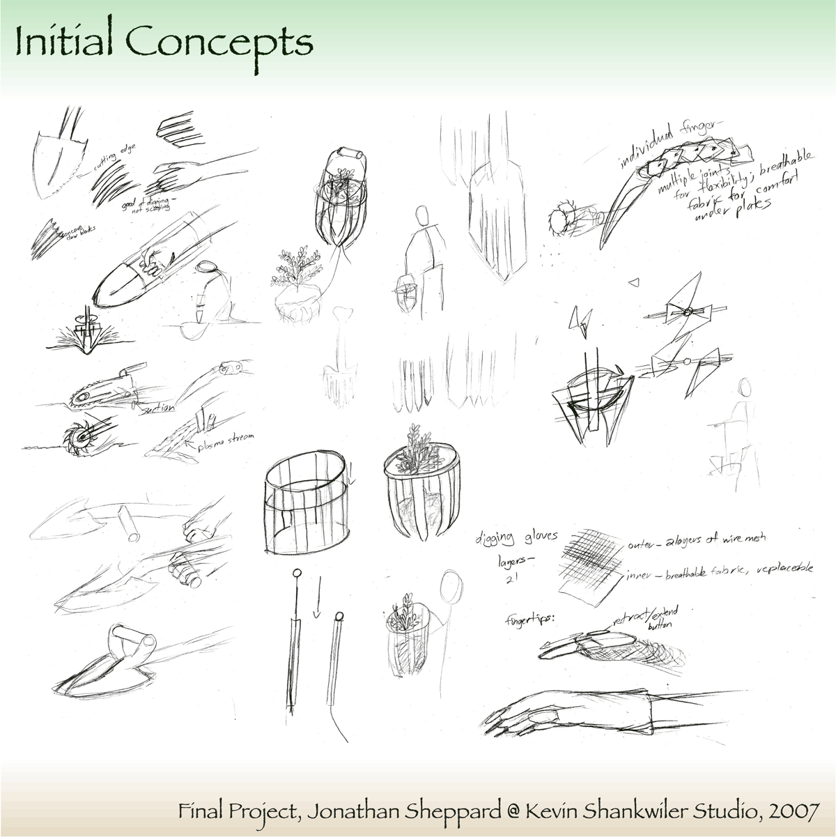 My group chose to design a product that would assist in transplanting a small- to medium-sized plant, reducing the stress exerted on the user's body. Research was gathered through personal experience, interviews with target consumers, precedent analyses, and interviews with professionals.Concept Sketches