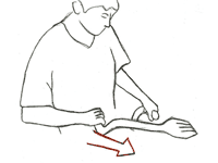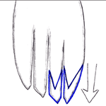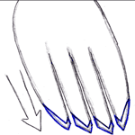 | A straight downward thrust focuses the force on two points to break up hard ground. | An angled thrust brings all four points into use, increasing the amount of soil breakup at the loss of some raw force. |