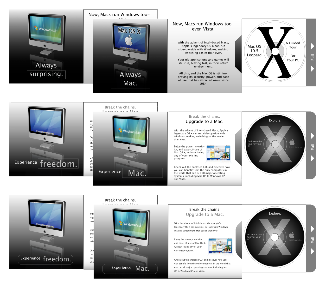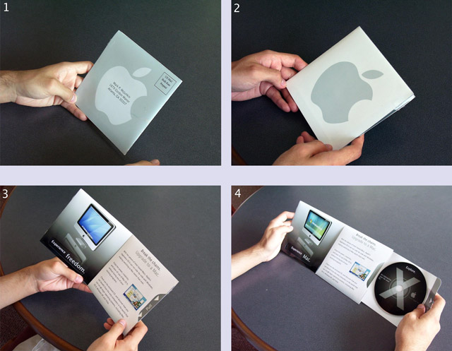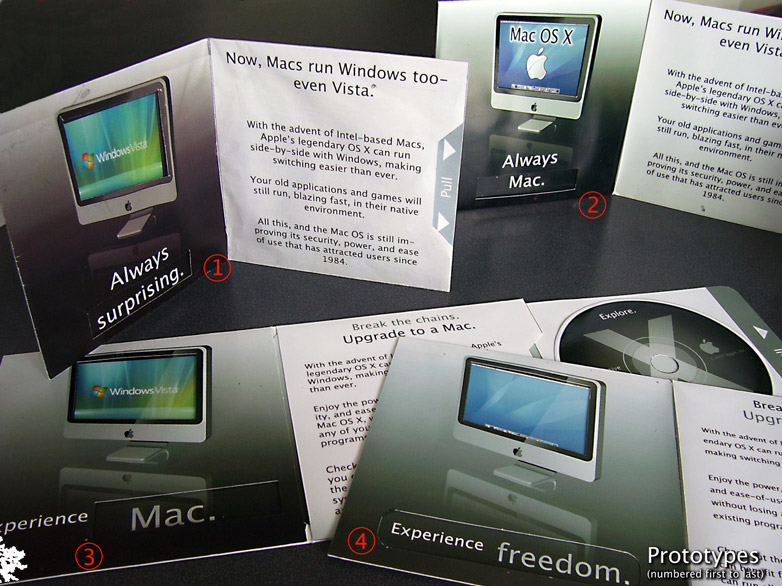 The final design was a single-fold mailer with a slide-out CD. While folded for mailing, the advertisement is a square with the address and postage on one side, and the only decoration is the Apple logo on both sides. Upon opening the mailer, the recipient is presented with a short message and invited to pull the tab on the right. Pulling the tab reveals the included demo CD, the iMac display changes from a Mac desktop to a Windows Vista wallpaper, and the second part of the "Experience Freedom- Experience Mac" slogan is revealed.