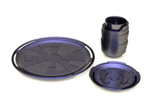 To verify my original intent to use clear glass, I did two other color studies. The gloss black showed the dependency of my design on its transparent nature. Though the iridescent blue would work well with the overall theme, it would severely overpower the food and drink it is meant to serve.