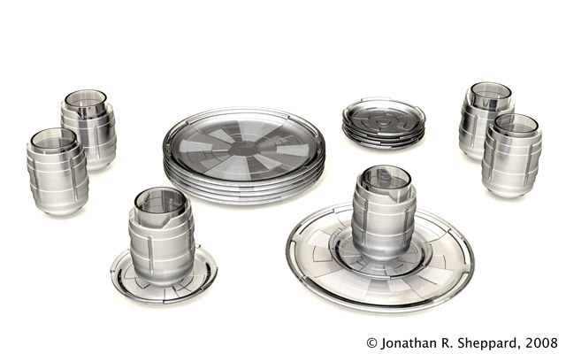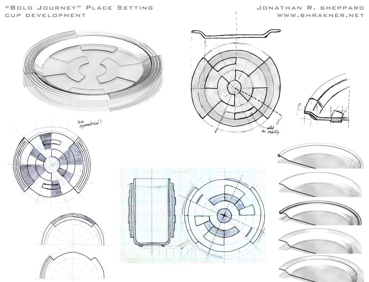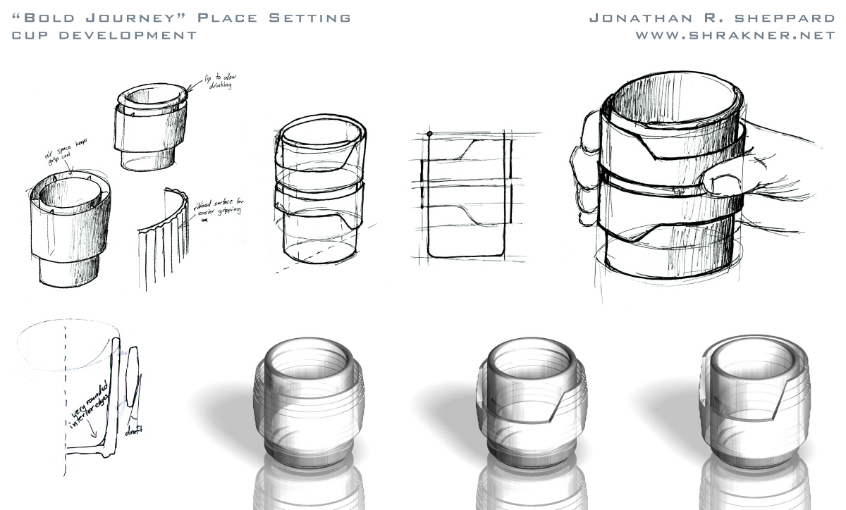 This was a short (two-week) assignment that introduced the class into designing a product family. The basic task was simple: design a place setting consisting of a cup, plate, and saucer. The design had to be based off a set of three key words and the three pieces had to work together as a product family.