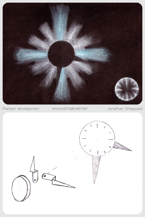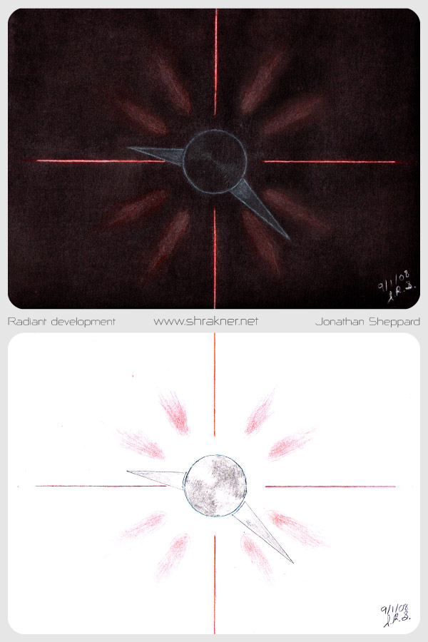 The following drawings explored the "radiant light" concept and led to the final design. Two drawings were done per concept, one on white paper to simulate the light effect in a bright room, and one on black paper to simulate its appearance in a dark room.