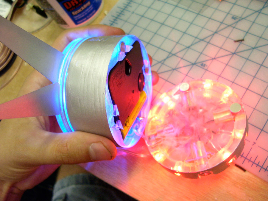 One discrepancy between the final model and the true design is that the minute and hour hands to not light up, due to the simplified setup I used for the blue LEDs. In the model, the LEDs shine straight up from the inside to hit light-gathering internal areas of the hands, a method that proved ineffectual. In a production model, a higher-torque clock motor and a set of rotary contacts would allow for smaller LEDs to shine into thicker clear plastic hands, resulting in much better illumination. The second-hand disc on the front suffers from a similar problem, which would also be corrected in an actual production model.