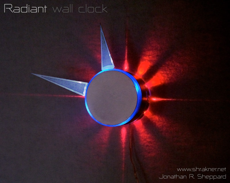 The final design of the clock uses four spread-beam lasers and six LEDs to project its face onto the wall it hangs on. The lasers mark the "cardinal points" of a clock (12, 3, 6, and 9) while the intermediary numbers are marked in a less precise manner with LEDs. An aluminum-finish cylinder serves as the primary housing. The hour and minute hands are clear plastic, backpainted silver, and illuminated with blue LEDs from the internal mechanism. Seconds are shown in a more vague manner with a brighter spot on the central blue ring.