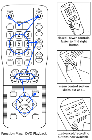 The central feature of this design was the multifunction wheel, similar to a joystick, that combined play, pause, stop, and multispeed fast forward and rewind into one simple control. This design also used the DVD/VCR toggle switch and used gestalt principles to separate buttons by functional group. Finally, the overall body of the remote has a concave right side to facilitate finger reach when operated with the right hand. |